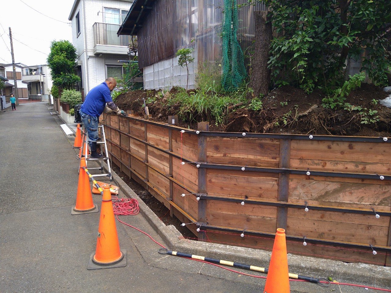 横浜市泉区 土留め工事1 2021 9/14 施工現場(作業中) 2021年9月14日 URLをコピーしました! 横浜市泉区で土留め工事が始まりました。某工務店様からの依頼です。既存の土留めは大谷石の為、地震等の崩壊が懸念されていました。 既存の建物も近い為、L型擁壁などの施工は難しく、3mのH鋼と矢板で土留めを設置して、RCの壁を施工します。 次にH鋼にアングルを溶接して、丸セパも溶接していきます。 次に鉄筋を組立てます。 最後に型枠を組立てて、本日生コンを打設します。 キレイに打設したいと思います。 施工現場(作業中) ㈱勝栄土建 勝栄土建 土止め 土留め工事 基礎 外構 横浜市泉区 神奈川県 藤沢市 鳶 鳶頭 よかったらシェアしてね! URLをコピーしました! URLをコピーしました! 鎌倉市西鎌倉 斜面伐採工事 白旗神社 宮神輿移動 関連記事 湘南台 恵光寺 信徒会館 外構工事 2026年2月24日 藤沢市 外構工事 2025年12月23日 平塚市 外構デッキ工事 2025年12月1日 藤沢市 外構改修工事 2025年8月22日 大田区 指掛け屋根設置 2025年6月29日 藤沢市 デッキ造作工事 2025年6月19日 藤沢市内 駐車場工事 2025年4月21日 南仲通り四丁目町内会 伐木作業 2025年2月14日