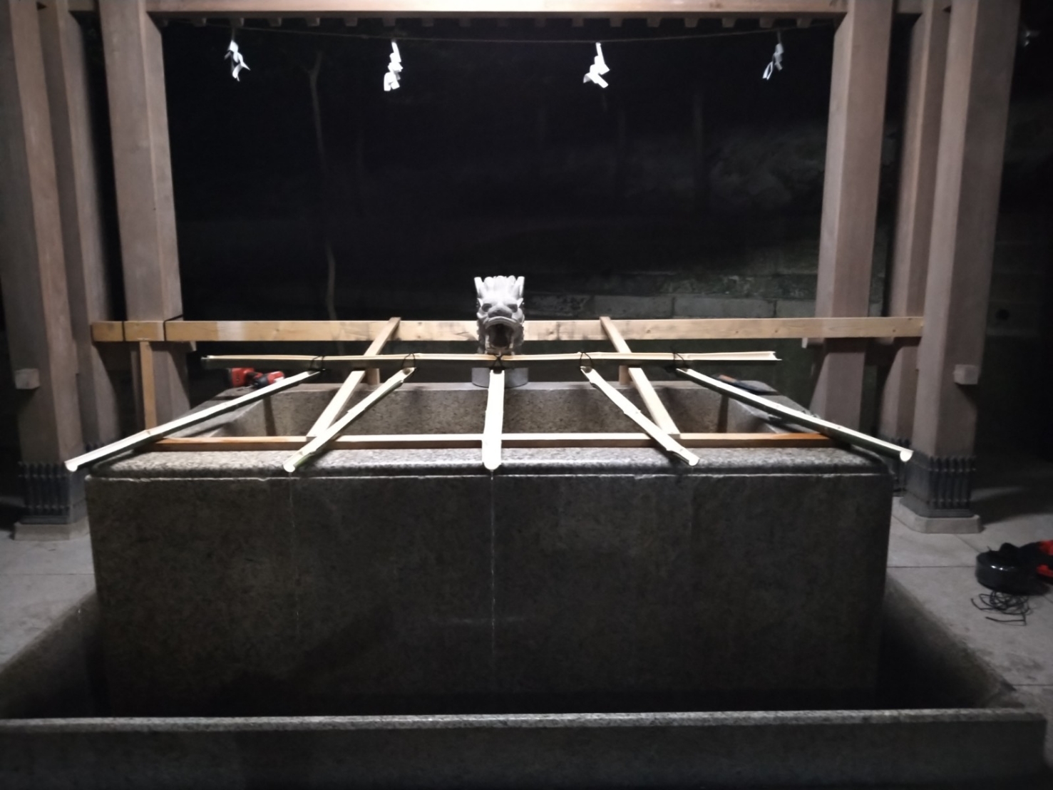 手水舎が大きいので、竹の水平を取り、まんべんなく水が出る様に設置するのは大変でした💦