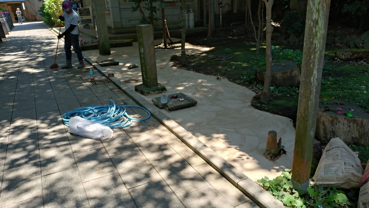 江島神社 中津宮 真砂土工事 2024 6/29 江島神社 鳶 2024年6月29日 URLをコピーしました! 江島神社の中津宮の境内に水溜まりが出来るので、真砂土にて解消しました。まずは施工場所に糸を張り整地作業、排水桝を切り下げました。 整地が終わったら材料搬入です。車が進入出来ない場所なので、階段・エスカレーターを使用してリヤカーを使い 6人で搬入しました。 真砂土を施工していきます。 1次散水 2次散水と作業して、養生をしてこちらは完了。 翌日も散水してから、3日おいて完了しました。最近の雨でも水溜まりは解消されました。 合間に社務所の狭い部分に、防水工事を施工しました。こちらは専門業者を呼び、施工して貰いました。 今までは少し室内に水が進入していた様ですが、しっかり止水された様です。 先週には宮神輿の修復も終わり、神輿庫に帰って来ました。 片瀬諏訪睦を中心に境内へ担ぎ、八坂神社へ納めました。7/14㈰の神幸祭が楽しみですね。いつもご依頼ありがとうございました🙇 江島神社 鳶 (株)勝栄土建 ㈱勝栄土建 八坂神社 八坂神社天王祭 勝栄 勝栄土建 外構 外構リフォーム 外構改修 天王祭 江島神社 江島神社末社八坂神社 神奈川県 藤沢市 藤沢市外構 藤沢市本町 鳶 よかったらシェアしてね! URLをコピーしました! URLをコピーしました! 白旗神社 源義経公 没後835年鎮霊祭 夏越の大祓い・片瀬海岸海開き 関連記事 2026年あけましておめでとうございます 2026年1月28日 2025 江島神社 正月支度 2025年12月30日 2025 正月飾り 2025年12月28日 2025白旗神社 正月支度 2025年12月10日 第50回 藤沢市民祭り 2025年9月30日 藤沢諏訪神社 2025例大祭 2025年8月28日 江の島灯籠 2025 大屋根設置 2025年7月25日 2025白旗神社 例大祭 支度 2025年7月19日