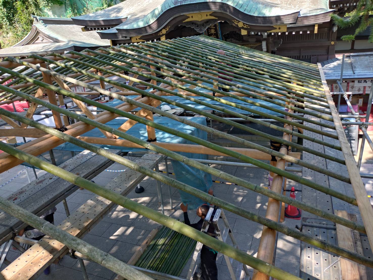 江島神社 切妻屋根設置 2024 8/10 江島神社 鳶 2024年8月10日 URLをコピーしました! 7月末に江島神社(辺津宮)境内に、切妻屋根を設置しました。昨年同様、江の島灯籠2024開催に合わせて設置しました。 まずは丸太を組み、足場を設置します。 次に下地の竹を組み、棕櫚縄で縛り付け葦簀を設置します。 雨除けのビニールを貼り、二つ割りで押縁を掛けて完了しました。 足場を撤去してウチの作業は完成。 境内の入口にミストシャワーを設置しました。涼しげになりました✨ 江ノ電の職員さんが貝殻をぶら下げて、完成。 8月末迄、江の島灯籠が開催されていますので、連休中に参拝されてはいかがでしょうか。いつもご依頼ありがとうございました🙇 江島神社 鳶 (株)勝栄土建 ㈱勝栄土建 勝栄 勝栄土建 基礎 外構 外構リフォーム 外構改修 江の島灯籠 江の島燈籠 江島神社 神奈川 神奈川県 藤沢 藤沢市 藤沢市外構 藤沢市本町 鳶 よかったらシェアしてね! URLをコピーしました! URLをコピーしました! 藤沢市 擁壁・外構工事 令和6年 藤沢諏訪神社 例大祭 関連記事 2026年あけましておめでとうございます 2026年1月28日 2025 江島神社 正月支度 2025年12月30日 2025 正月飾り 2025年12月28日 2025白旗神社 正月支度 2025年12月10日 第50回 藤沢市民祭り 2025年9月30日 藤沢諏訪神社 2025例大祭 2025年8月28日 江の島灯籠 2025 大屋根設置 2025年7月25日 2025白旗神社 例大祭 支度 2025年7月19日