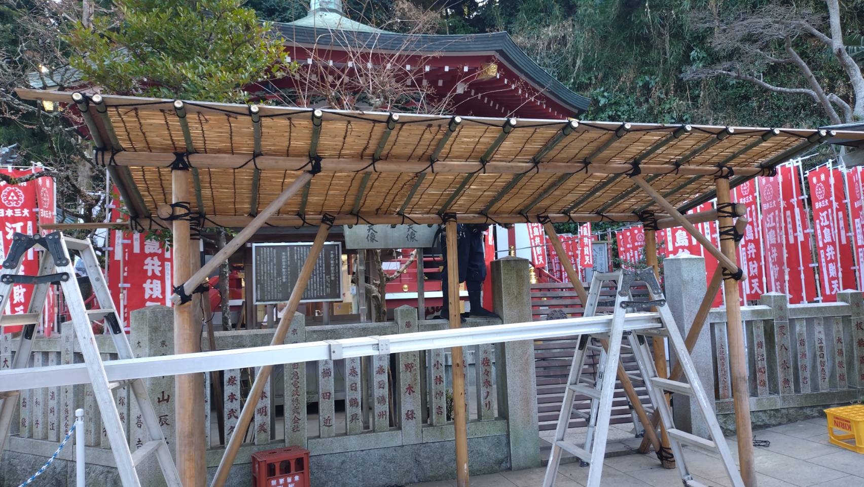 3月の初めに正月準備で、一時撤去していた授与所を再設置しました。正月用の仮設テントを撤去してから、作業開始です。まずは丸太を組立てます。