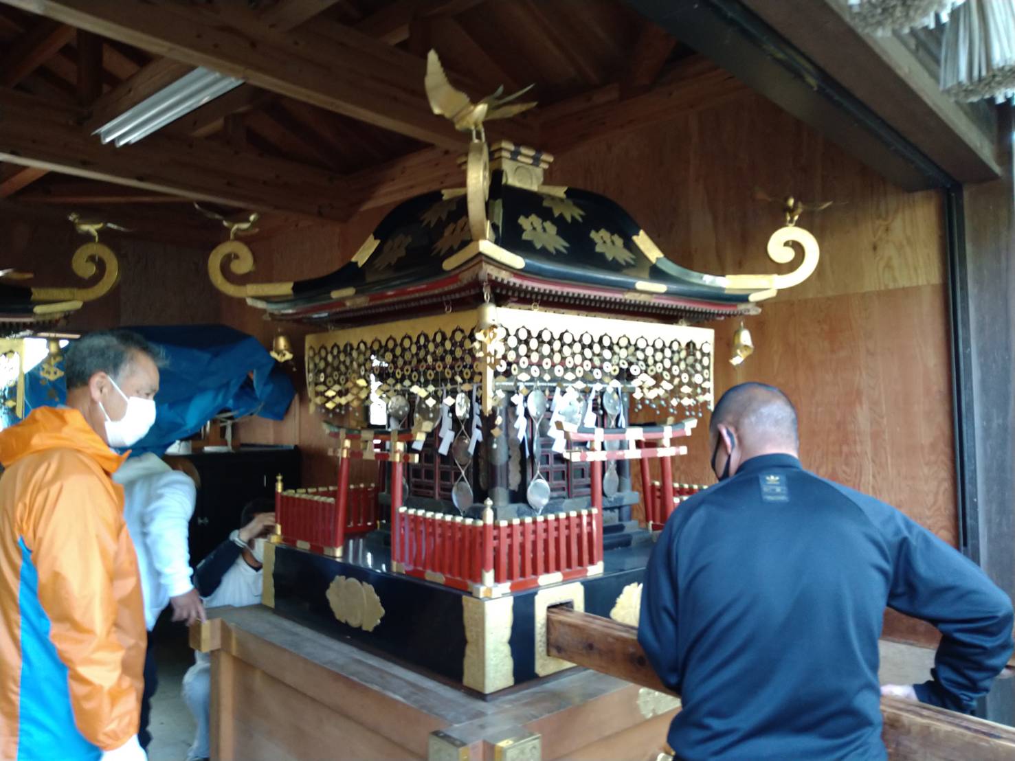 昨日の日曜日8:00から、白旗神社にて宮神輿(義経・弁慶)2基を神輿殿に移動しました。毎年この時期に神輿を飾るのですが、去年はコロナウィルスの為、飾る事が出来ませんでした。本年は例祭を開催する意気込みも合わせ、飾る事になりました。㈱勝栄土建からは5名参加しました。まずは神輿庫から台座と神輿を順番に運搬していきます。