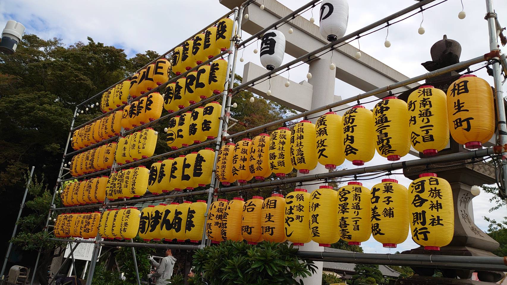 白旗神社 提灯掛け・稲藁選り 2020 10/20 地域活動 白旗神社 鳶 2020年10月20日 URLをコピーしました! 10/18㈰は白旗神社にて提灯掛けが、総代・牛若会・神輿保存会・山車囃子保存会、参加のもと行われました。㈱勝栄土建からは2名参加しました。酉の市が11/2・14・26と境内で開催される為、早めに作業しました。まずは足場を取付けて作業します。 まだまだ空きがありますが、設置完了しました。 それから年末に作る注連縄の稲藁を、参加者で選っていきます。 選った稲藁は年末に、稲毛神社から講師と鳶頭を招いて、拝殿様に作りたいと思います。参加された皆様お疲れ様でした。 地域活動 白旗神社 鳶 ㈱勝栄土建 勝栄土建 土木 基礎 外構 提灯掛け 白旗神社 神奈川県 藤沢市 鳶 よかったらシェアしてね! URLをコピーしました! URLをコピーしました! 白旗神社 源義経公没後830年記念事業(参道整備4) 茅ヶ崎市小和田 外構工事1 関連記事 2026年あけましておめでとうございます 2026年1月28日 2025 江島神社 正月支度 2025年12月30日 2025 正月飾り 2025年12月28日 2025白旗神社 正月支度 2025年12月10日 第50回 藤沢市民祭り 2025年9月30日 藤沢諏訪神社 2025例大祭 2025年8月28日 江の島灯籠 2025 大屋根設置 2025年7月25日 2025白旗神社 例大祭 支度 2025年7月19日