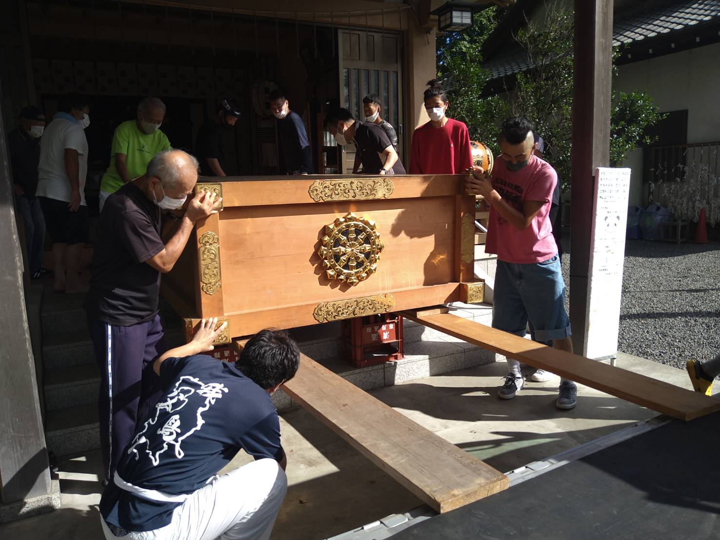 白旗神社 宮神輿移動 2021 9/20 地域活動 白旗神社 鳶 2021年9月20日 URLをコピーしました! 日曜日は白旗神社にて、宮神輿を神輿庫に移動しました。㈱勝栄土建からの参加は8名です。来月より神社も、七五三の準備やらで忙しくなりますので、毎年この時期に神輿保存会・神職・総代などの参加者で作業します。まずは神輿を軽トラックに載せて、運搬します。 それから台車を移動します。これも重いので足場板を敷いて作業します💦 神輿の収蔵庫に移動して、埃が被らない様にブルーシートで養生して安置します。 次に祈祷殿の清掃をします。 合間に金棒突きの練習👏 祈祷殿もキレイになりました。参加された皆様、お疲れ様でした。 午後からは寒川神社の流鏑馬を、初めて見学に行きました。 コロナウイルスまん延防止対策の為、例祭参加者のみの観覧だったので、大変良い席で見る事が出来ました。鈴木宮司様(白旗神社)ありがとうございました。来年も観覧したいと思います👏 地域活動 白旗神社 鳶 ㈱勝栄土建 勝栄土建 基礎 外構 宮神輿 寒川神社 流鏑馬 白旗神社 神奈川県 藤沢市 鳶 よかったらシェアしてね! URLをコピーしました! URLをコピーしました! 横浜市泉区 土留め工事1 地鎮祭・結婚式・祝賀会 お手伝い 関連記事 2026年あけましておめでとうございます 2026年1月28日 2025 江島神社 正月支度 2025年12月30日 2025 正月飾り 2025年12月28日 2025白旗神社 正月支度 2025年12月10日 第50回 藤沢市民祭り 2025年9月30日 藤沢諏訪神社 2025例大祭 2025年8月28日 江の島灯籠 2025 大屋根設置 2025年7月25日 2025白旗神社 例大祭 支度 2025年7月19日
