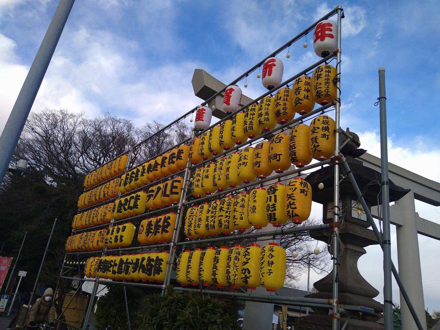 本日は13:00より各団体と、提灯掲揚・おみくじ縄交換・どんど焼き場所用意・等を作業しました。