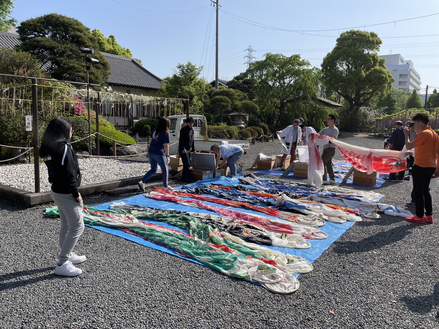 今年の白旗神社 牛若祭り(5/5)の支度が始まりました。牛若会・総代・神輿保存会・山車囃子保存会と4/21㈰に鯉のぼりのロープ張りを行いました。今年も志賀産業㈱様から高所作業車のリース奉納が行われました。安全に作業出来て助かります。