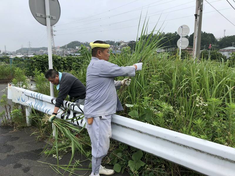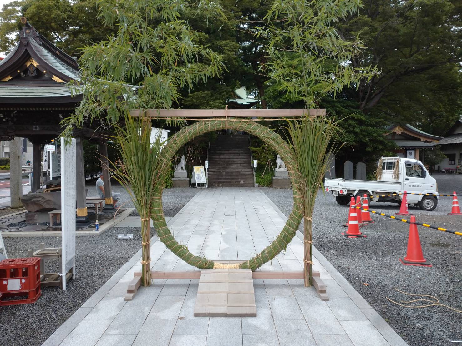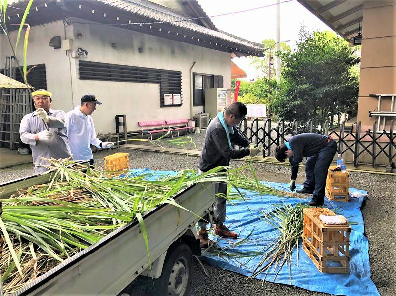 白旗神社 茅の輪奉製 2020 6/28 地域活動 施工現場(作業中) 白旗神社 鳶 2020年6月28日 URLをコピーしました! 6/27,28と白旗神社にて、茅の輪の奉製作業が行われました。総代・牛若会・神職が参加して、勝栄土建からは2名参加しました。昨日は河川敷に茅を刈りに行きました。 神社へ戻り、茅を選って束にします。 昨日の作業は午前中で止めて ここまで。本日はまず、下地の注連縄に、束にした茅を取り付けていきます。 次に麻縄で時計回りに締め付けて、枠台座に固定します。 鳥居の前に設置します。 最後に注連縄に、紙垂・人形を取り付けて完成となります。6/30に大祓い式が執り行われ、茅の輪は解放となります。コロナウィルス感染症撲滅の為、いつもより長く設置するとの事です。本日作業された皆さま、お疲れ様でした。 地域活動 施工現場(作業中) 白旗神社 鳶 (株)勝栄土建 勝栄土建 基礎 外構 大祓い 白旗神社 神奈川県 茅の輪 藤沢市 鳶 よかったらシェアしてね! URLをコピーしました! URLをコピーしました! 藤沢市本鵠沼 外構工事4 江島神社 茅の輪奉製 関連記事 湘南台 恵光寺 信徒会館 外構工事 2026年2月24日 2026年あけましておめでとうございます 2026年1月28日 2025 江島神社 正月支度 2025年12月30日 2025 正月飾り 2025年12月28日 藤沢市 外構工事 2025年12月23日 2025白旗神社 正月支度 2025年12月10日 平塚市 外構デッキ工事 2025年12月1日 第50回 藤沢市民祭り 2025年9月30日