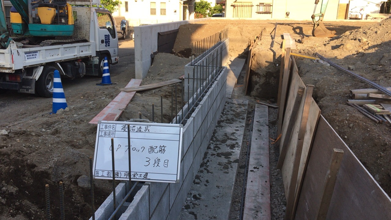 擁壁工事が完了したので今度は型枠ブロック工事が始まりました。後は区割りのブロック工事が終われば整地をして完了となります。