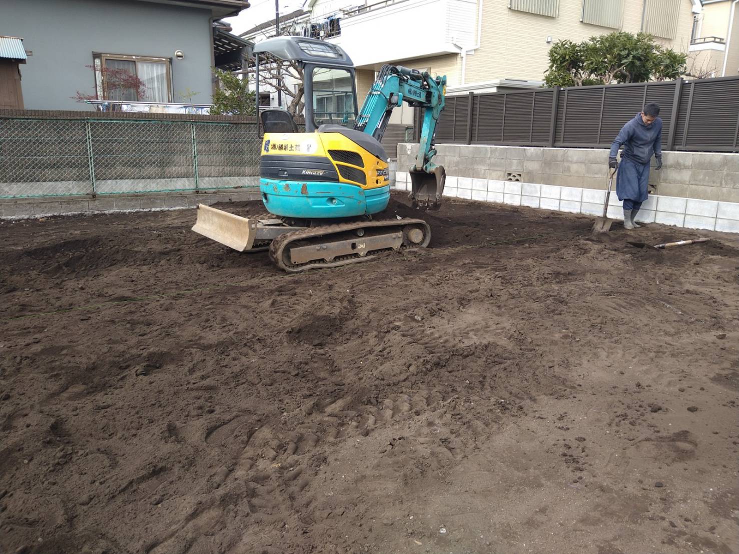 藤沢市湘南台で駐車場 舗装工事が始まりました。いつもお世話になっております近所の解体屋さんの仕事です。外周のブロック工事が完了したので、敷地を鋤取りします。