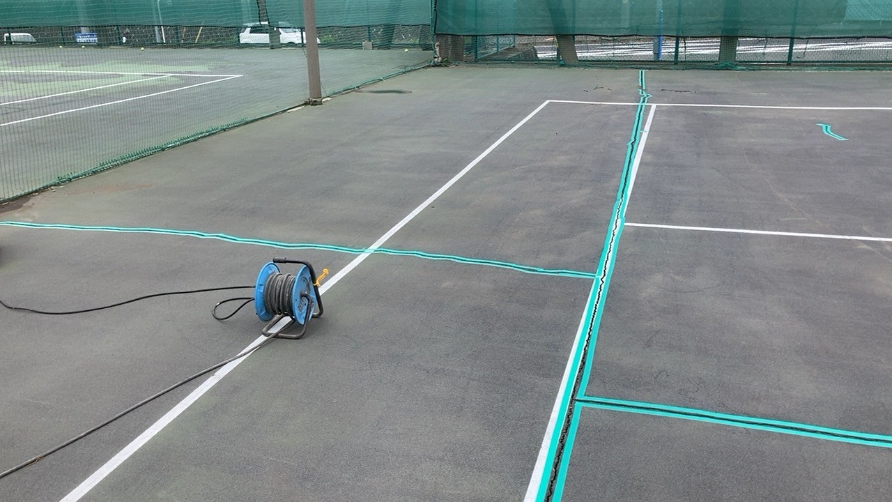 藤沢市でテニスコートの補修工事が完了しました。鳶組合OB様の紹介物件になります。本格的なコート専門業者に頼むと、とんでもない金額になる為、数年持つ様な補修ということで受注しました。3コートあるので、3週間(2日ずつ)に分けて掛けて施工しました。コート全体に ひどいヒビ割れがあります。まずは高圧洗浄機で水洗いします。