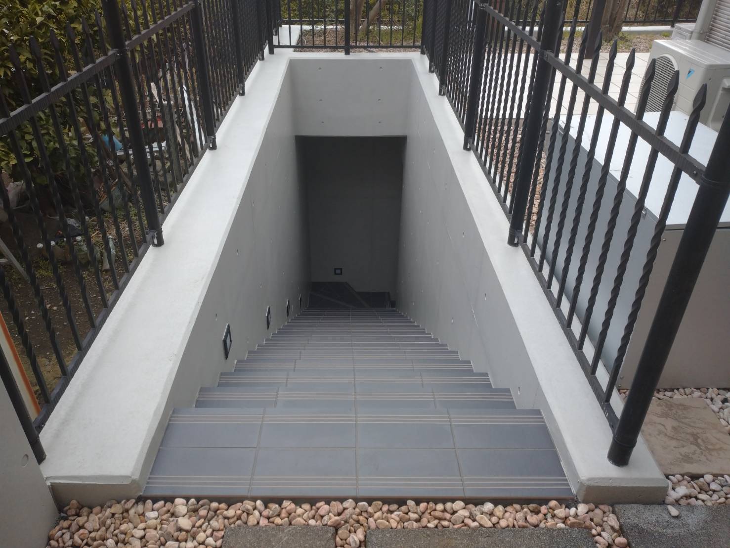 藤沢市善行で外構のリフォーム工事が完成しました。約2年前より相談を受けてましたが友人の為、施工時期が遅くなり申し訳なかったです。外構リフォームの大きな内容は、コンクリート打ちっぱなし壁の修繕と、階段のタイル貼りになります。まずは既存の階段モルタルを解体します。経年劣化で浮いてる所もあり、剥がれやすかったです。