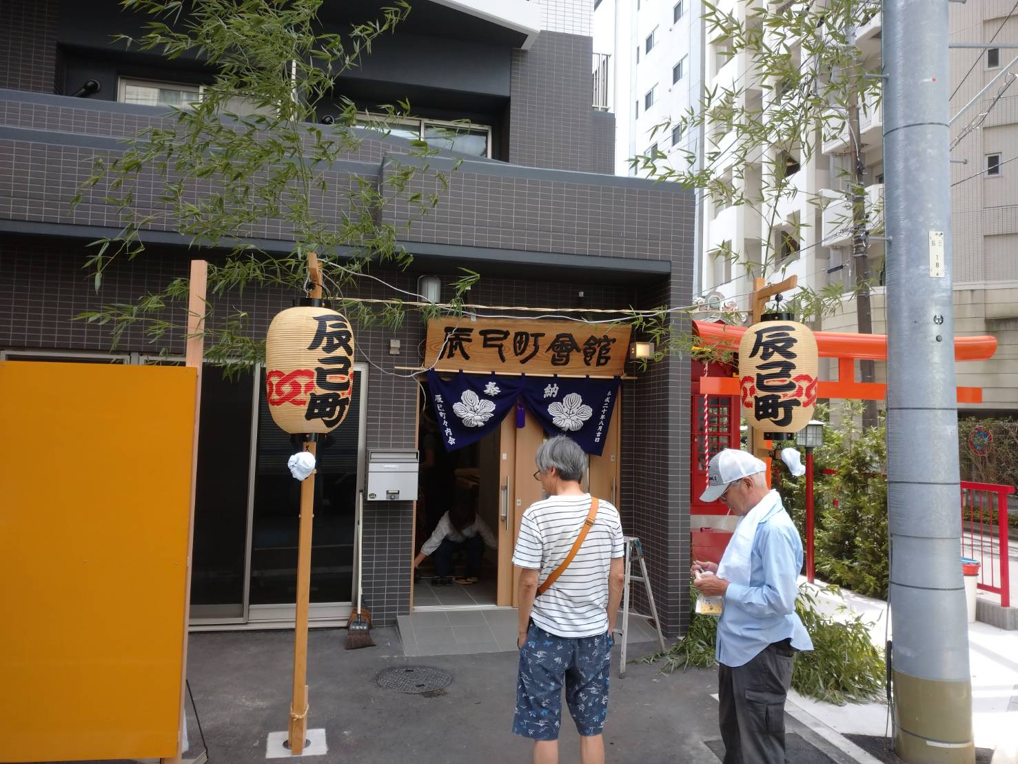 今日はまず自分の町内、辰巳町の飾り付けから始まりました。マンションの1階に建て替えられてから、初めての祭り支度になります。材料も全部新調して飾りました。