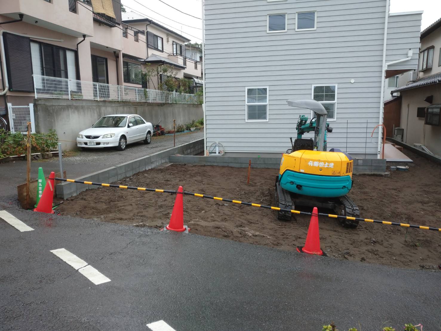 ブロック工事が完了したので、昨日からは駐車場の掘削工事が始まりました。道路の勾配がキツい為、土間コンの高さが肝となります。しっかりと仕上げて行きます。