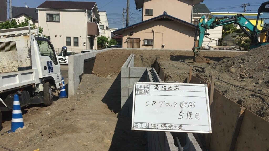 擁壁工事が完了したので今度は型枠ブロック工事が始まりました。後は区割りのブロック工事が終われば整地をして完了となります。 -