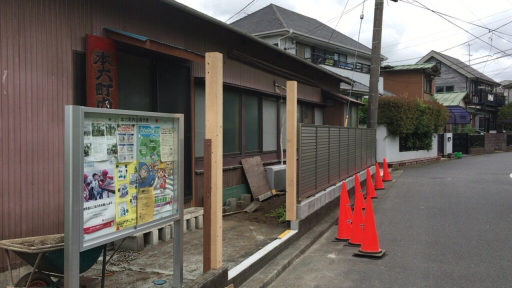 本日より本六町町内会館の外構改修工事が始まりました。古い外壁を解体して、新しい外壁を設置します。会館の入り口の段差解消工事も施工します。 -