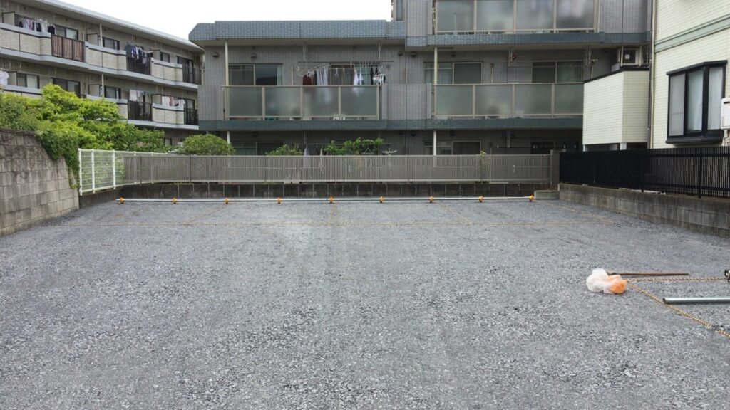 本鵠沼の駐車場工事が完成しました。砕石仕上げの為、車止めは単管パイプ・区割りはトラロープで仕上げました。ありがとうございました。 -