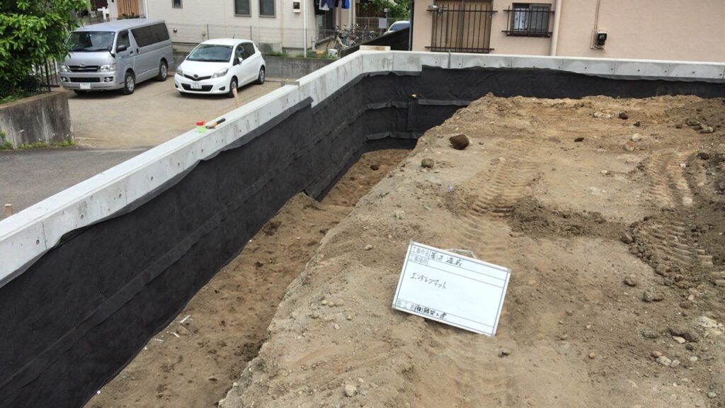 茅ヶ崎市 造成工事の型枠が外れました。水抜きパイプ位置にエンドレンマットを設置しました。明日から埋め戻し作業に入り、ブロック工事が始まります。 -