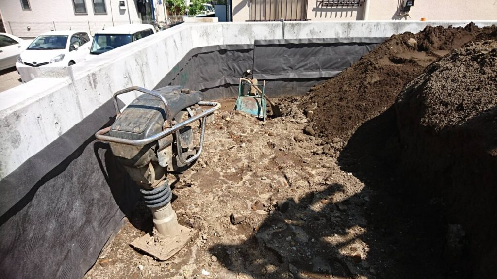 茅ヶ崎の造成工事の埋め戻し作業が始まりました。ランマーで転圧しながら埋めて行きます。埋め戻しが終わったら型枠ブロック工事が始まります。また更新します。 -