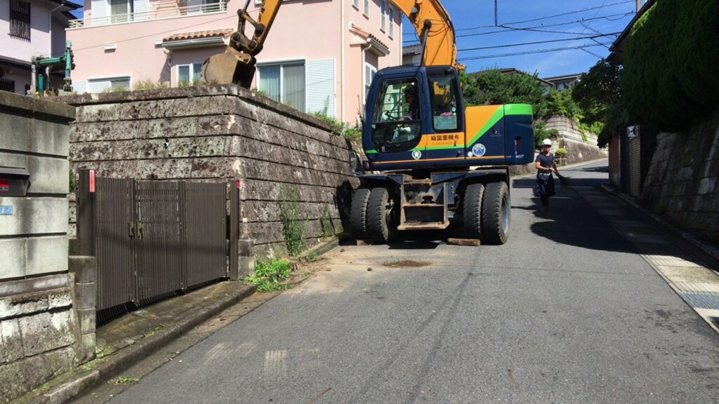 月曜日から逗子市で造成工事が始まりました。残土を搬出しながら大谷石を解体していきます。 あと少しで根伐りが完了します。 -