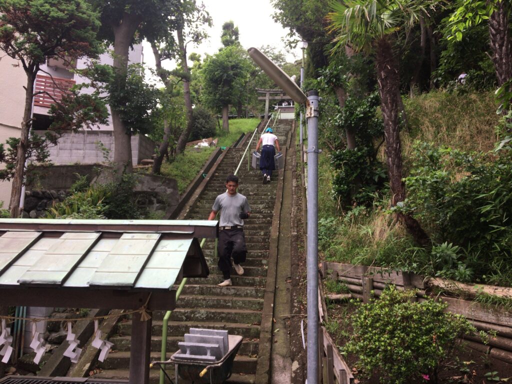 6月末より片瀬諏訪神社(上社)で頭の甘糟さん(藤沢鳶職組合 前組頭)より依頼され、土止め工事が始まりました。古いブロックが土圧で崩壊しそうなので手前に型枠ブロック...