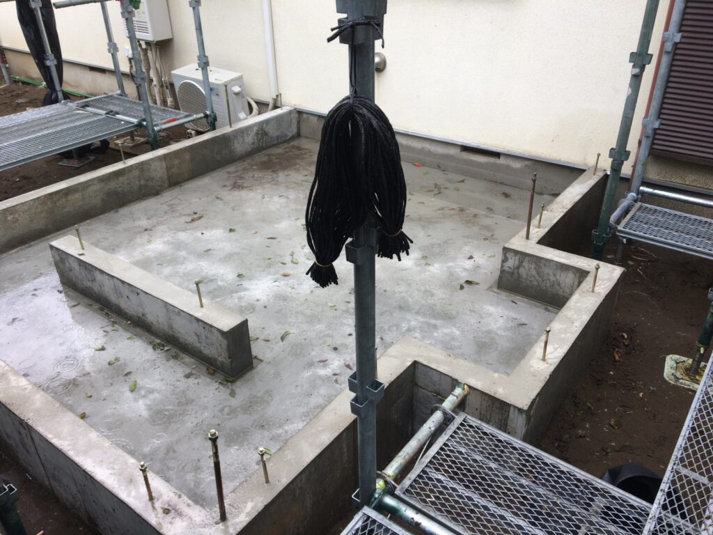 片瀬諏訪神社の増築工事の基礎・足場が完了しました。先週の生コン打設からアップします。ベースと立ち上がりのコンクリートを一体で打設しました。 神輿保存会の神輿庫...