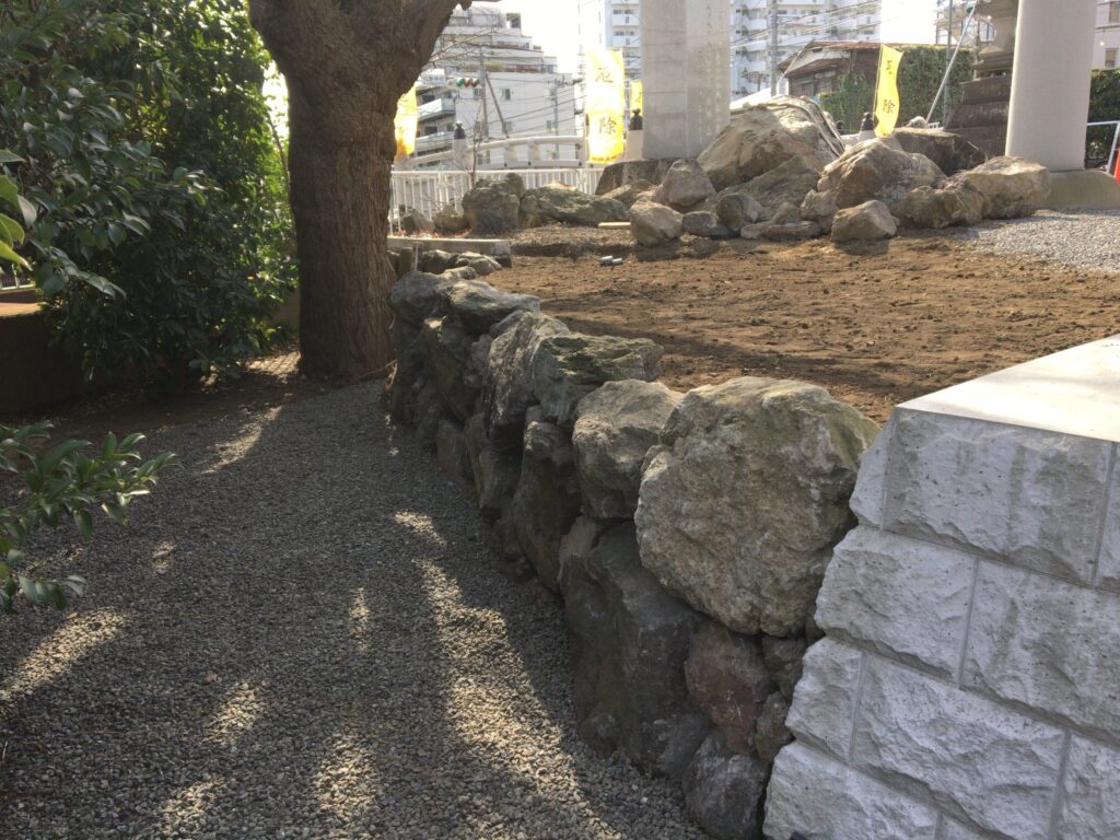 白旗神社の流れ(禊川)作成の為、石積み工事が完了しました。既存の大きな自然石を再利用してるので、重機を使いながら慎重に作業しました。 裏込めコンクリートを打設し... -