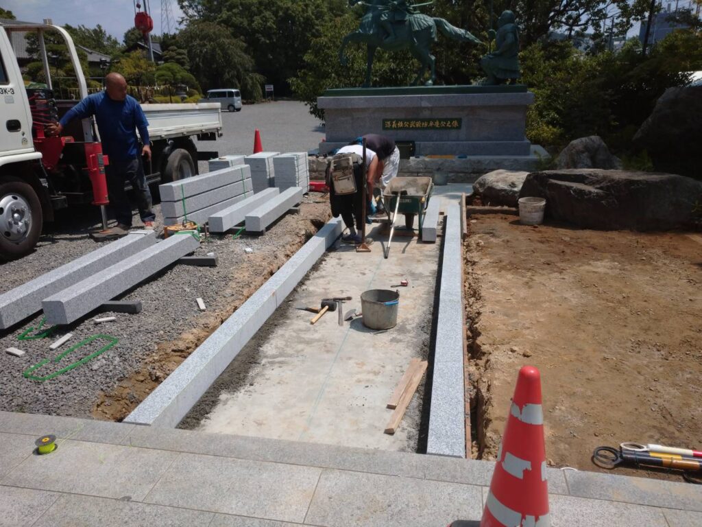 銅像への参道が完了しました。縁石を設置してから下地のコンクリートを打設します。 それから敷石を貼っていきます。 目地を入れて清掃して、通路は完成しました。 合間... -