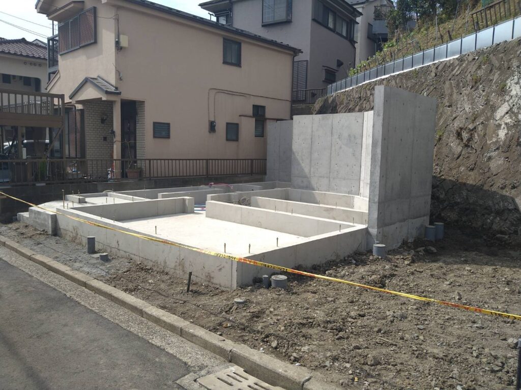 横浜市南区の基礎工事が完了しました。裏側が山を背負ってる為、防護壁付の基礎工事です。 型枠を撤去して完了です。 ありがとうございました👏 -