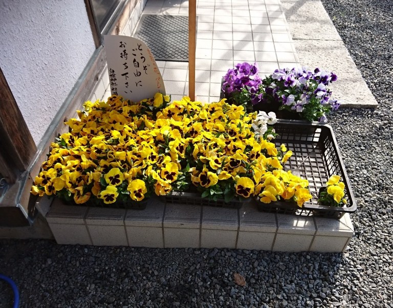 月初めの為、白旗神社へお参り。いつもの様に神棚の榊を頂きました。そして宮司の兼務社である石川佐波神社より、パンジーも頂きました。