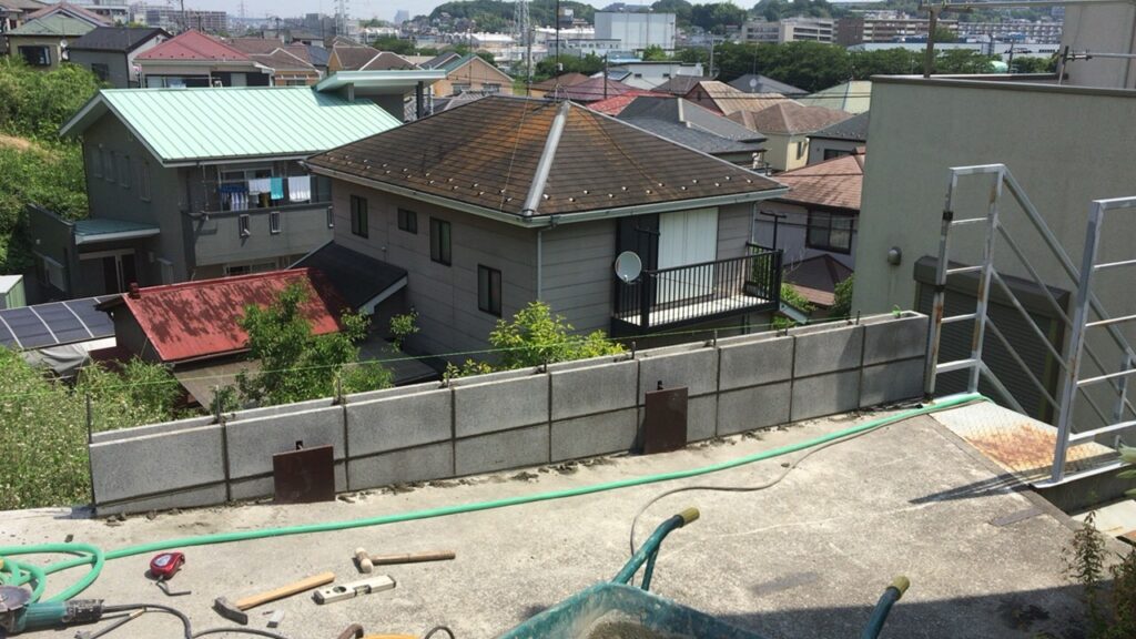 本日より戸塚区で落下防止の外構改修工事が始まりました。H綱があり特殊な場所にブロックを加工しながら設置します。あとはフェンスを設置すれば完了となります。 -